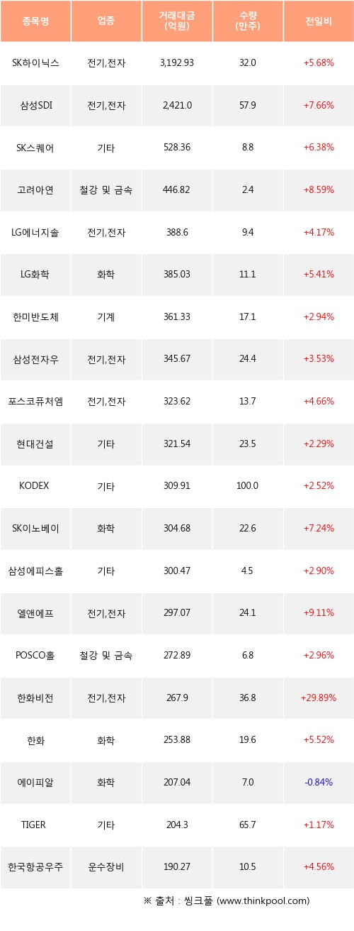 외국인 투자자의 순매수 상위 20개 종목은 SK하이닉스, 삼성SDI, SK스퀘어, 고려아연, LG에너지솔루션, LG화학, 한미반도체, 삼성전자우, 포스코퓨처엠, 현대건설등이다.