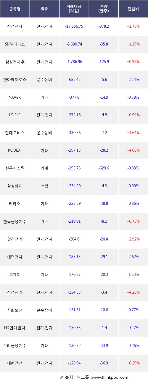 외국인 투자자의 순매도 상위 20개 종목은 삼성전자, SK하이닉스, 삼성전자우, 한화에어로스페이스, NAVER, LS ELECTRIC, 현대모비스, KODEX 레버리지, 한온시스템, 삼성화재등이다.