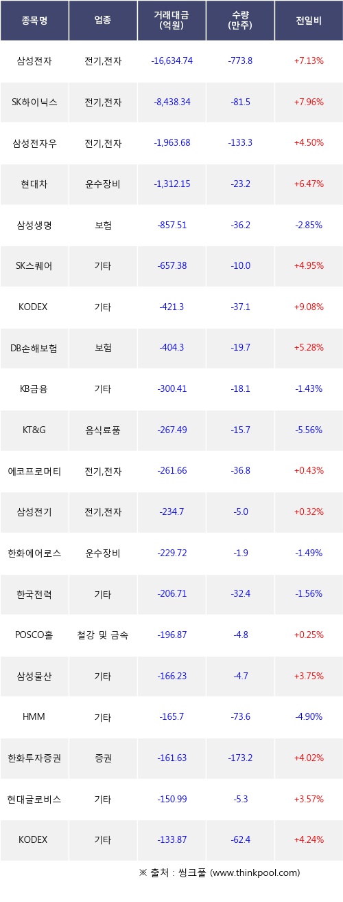 외국인 투자자의 순매도 상위 20개 종목은 삼성전자, SK하이닉스, 삼성전자우, 현대차, 삼성생명, SK스퀘어, KODEX 레버리지, DB손해보험, KB금융, KT&G등이다.