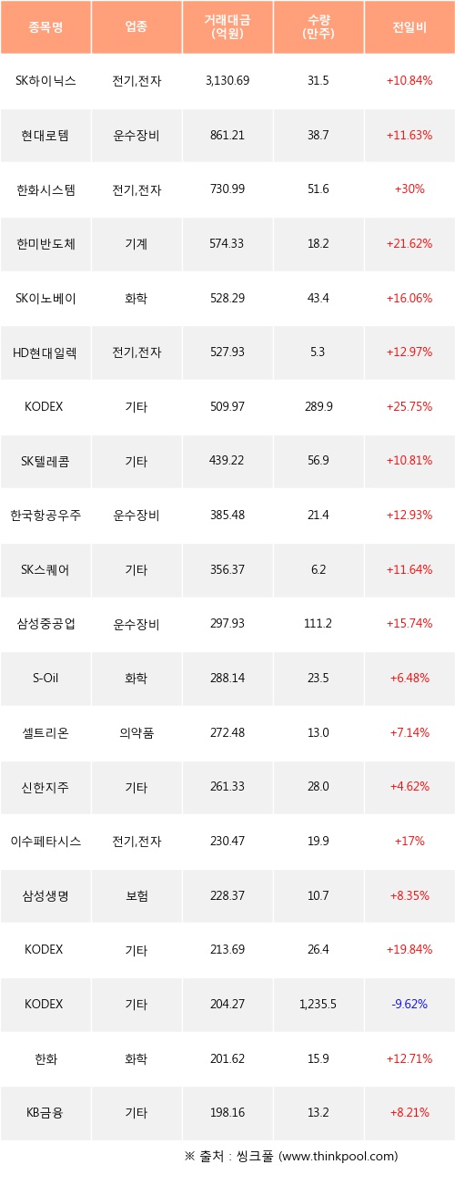 SK하이닉스, 현대로템, 한화시스템 등은 전일 대비 주가가 상승했고, KODEX 인버스 등은 주가가 하락했다.