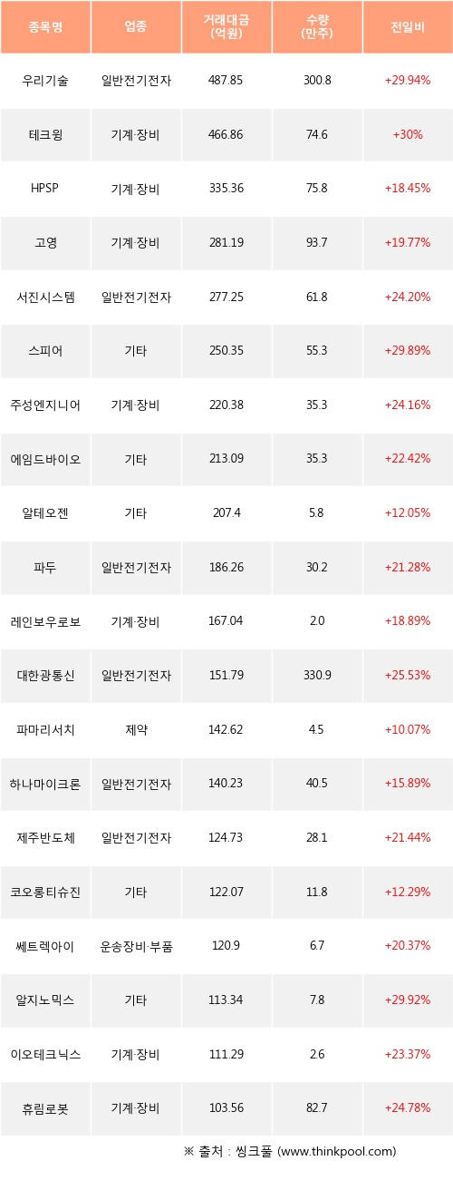 외국인 투자자의 순매수 상위 20개 종목은 우리기술, 테크윙, HPSP, 고영, 서진시스템, 스피어, 주성엔지니어링, 에임드바이오, 알테오젠, 파두등이다.