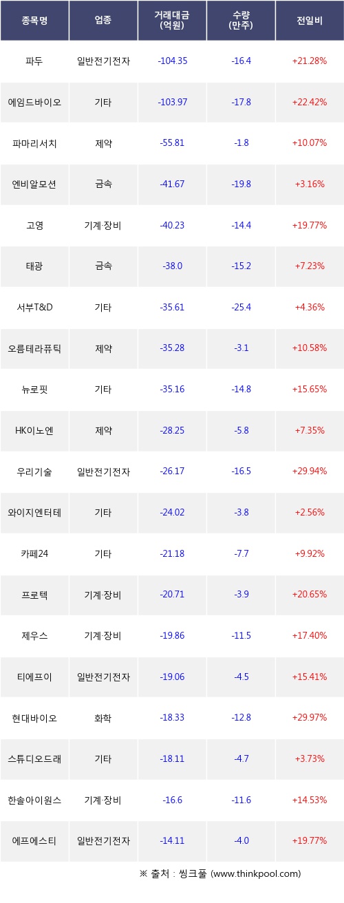 기관 투자자의 순매도 상위 20개 종목은 파두, 에임드바이오, 파마리서치, 엔비알모션, 고영, 태광, 서부T&D, 오름테라퓨틱, 뉴로핏, HK이노엔등이다.