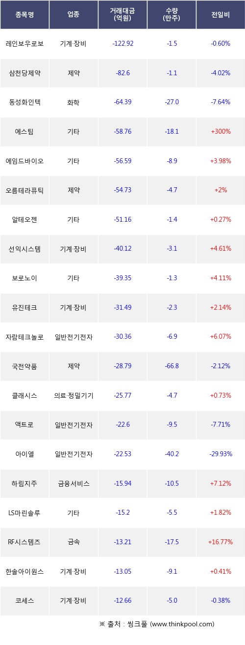 기관 투자자의 순매도 상위 20개 종목은 레인보우로보틱스, 삼천당제약, 동성화인텍, 에스팀, 에임드바이오, 오름테라퓨틱, 알테오젠, 선익시스템, 보로노이, 유진테크등이다.