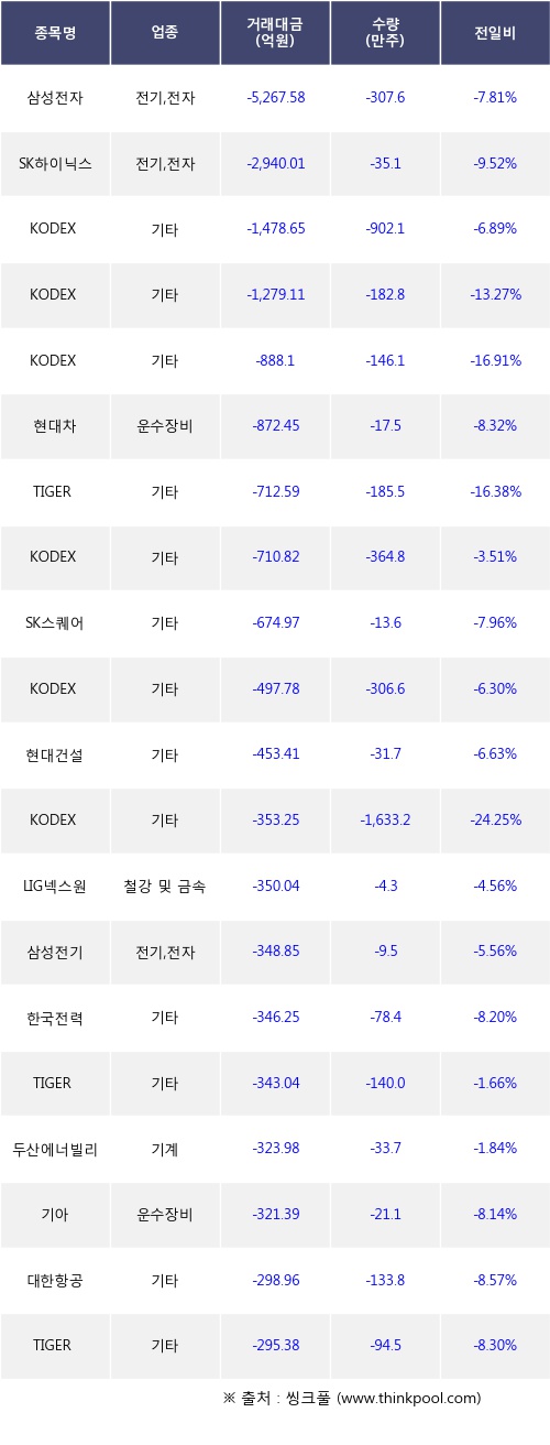 이날 기관 투자자가 순매도한 종목들 중에 삼성전자, SK하이닉스, KODEX 코스닥150레버리지 등은 전일 대비 주가가 하락했다.