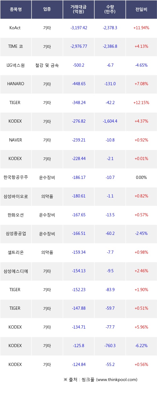 기관 투자자의 순매도 상위 20개 종목은 KoAct 코스닥액티브, TIME 코스닥액티브, LIG넥스원, HANARO Fn K-반도체, TIGER 레버리지, KODEX 2차전지산업레버리지, NAVER, KODEX CD금리액티브(합성), 한국항공우주, 삼성바이오로직스등이다.
