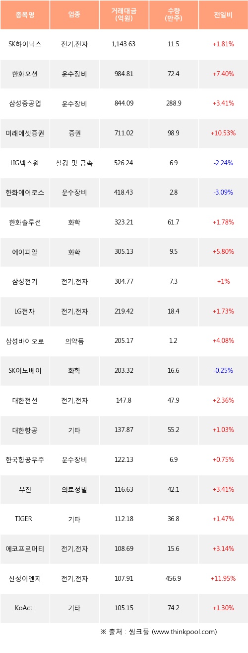 SK하이닉스, 한화오션, 삼성중공업 등은 전일 대비 주가가 상승했고, LIG넥스원, 한화에어로스페이스, SK이노베이션 등은 주가가 하락했다.