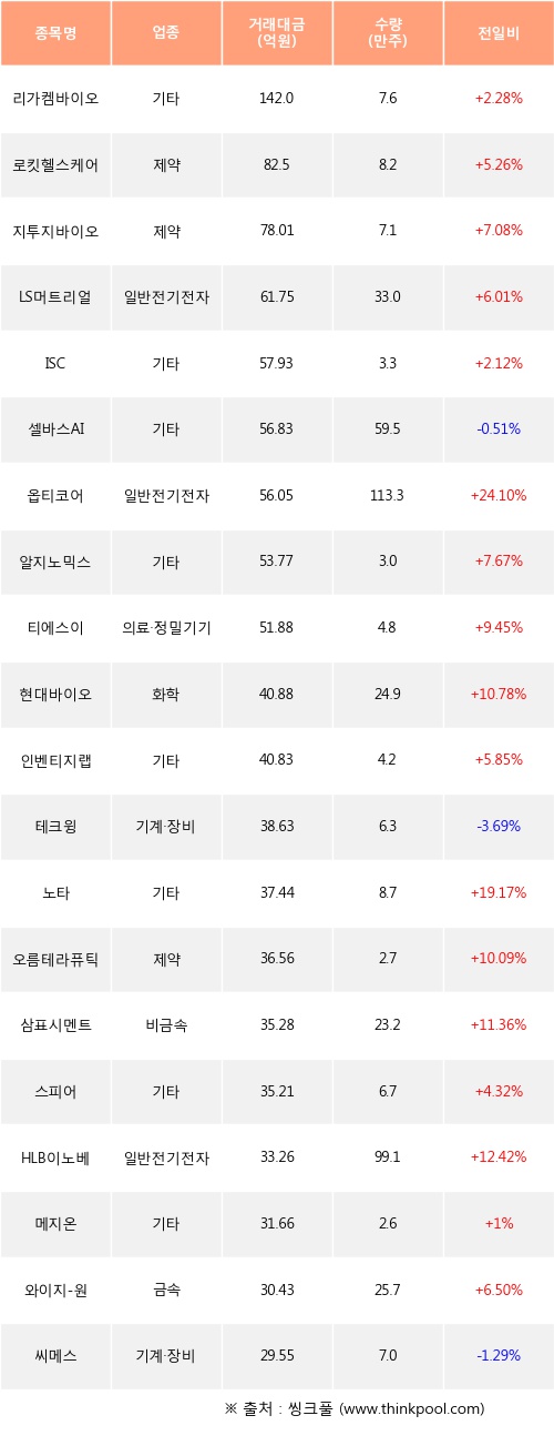 외국인 투자자의 순매수 상위 20개 종목은 리가켐바이오, 로킷헬스케어, 지투지바이오, LS머트리얼즈, ISC, 셀바스AI, 옵티코어, 알지노믹스, 티에스이, 현대바이오등이다.