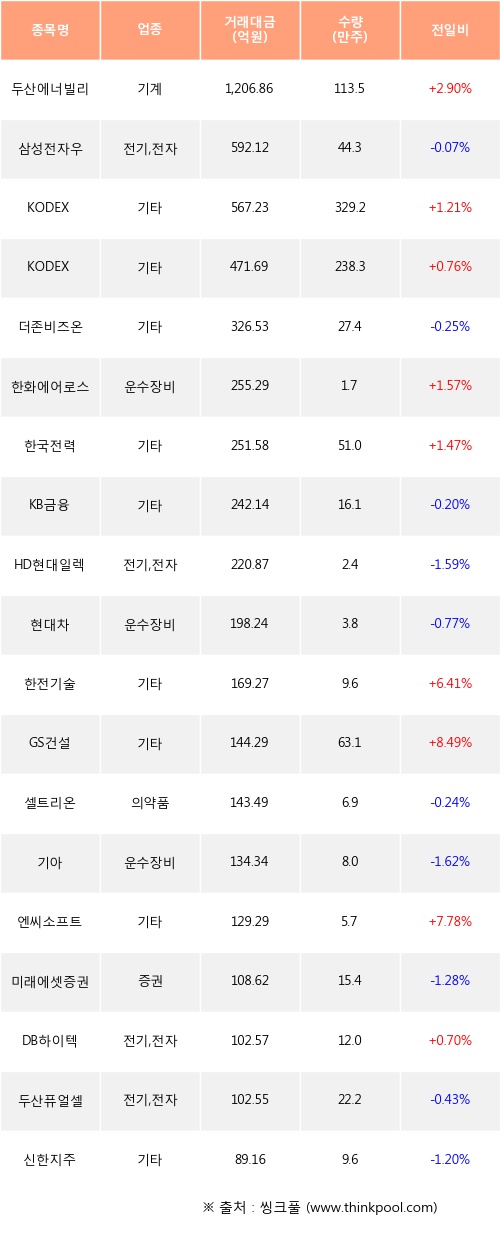두산에너빌리티, KODEX 코스닥150레버리지, KODEX 코스닥150 등은 전일 대비 주가가 상승했고, 삼성전자우, 더존비즈온, KB금융 등은 주가가 하락했다.