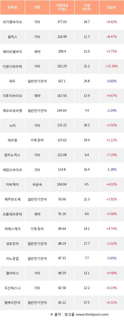 리가켐바이오, 올릭스, 에이비엘바이오 등은 전일 대비 주가가 상승했고, 파두, 에코프로비엠, 에임드바이오 등은 주가가 하락했다.