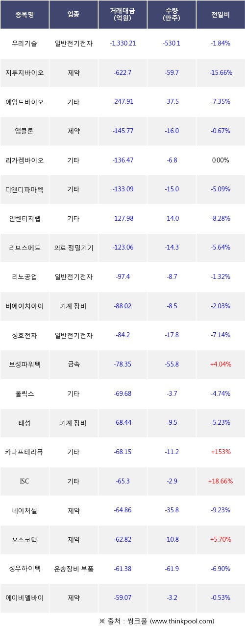 외국인 투자자의 순매도 상위 20개 종목은 우리기술, 지투지바이오, 에임드바이오, 앱클론, 리가켐바이오, 디앤디파마텍, 인벤티지랩, 리브스메드, 리노공업, 비에이치아이등이다.