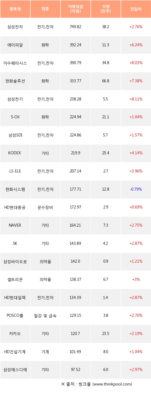 외국인 투자자의 순매수 상위 20개 종목은 삼성전자, 에이피알, 이수페타시스, 한화솔루션, 삼성전기, S-Oil, 삼성SDI, KODEX 레버리지, LS ELECTRIC, 한화시스템등이다.