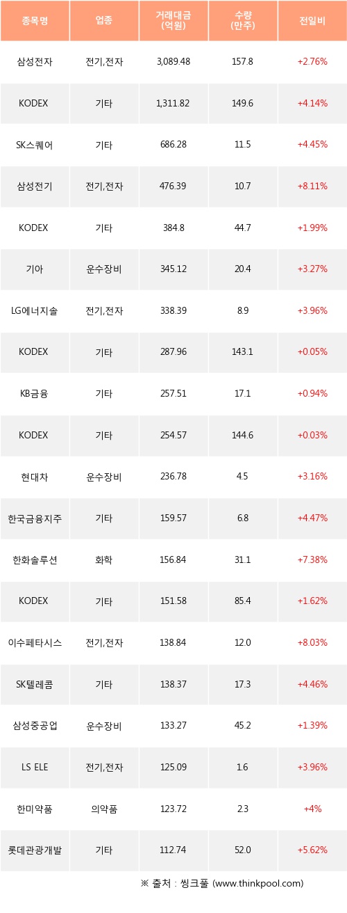 기관 투자자의 순매수 상위 20개 종목은 삼성전자, KODEX 레버리지, SK스퀘어, 삼성전기, KODEX 200, 기아, LG에너지솔루션, KODEX 코스닥150, KB금융, KODEX 코스닥150레버리지등이다.