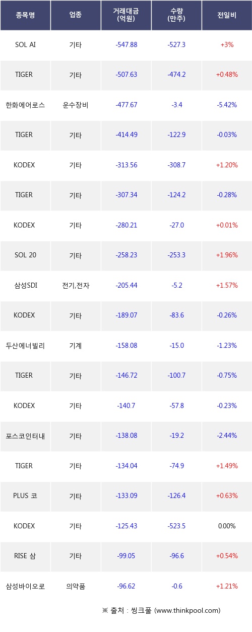 기관 투자자의 순매도 상위 20개 종목은 SOL AI반도체TOP2플러스, TIGER 기술이전바이오액티브, 한화에어로스페이스, TIGER 반도체TOP10, KODEX 미국우주항공, TIGER 미국S&P500, KODEX 머니마켓액티브, SOL 200타겟위클리커버드콜, 삼성SDI, KODEX 미국S&P500등이다.