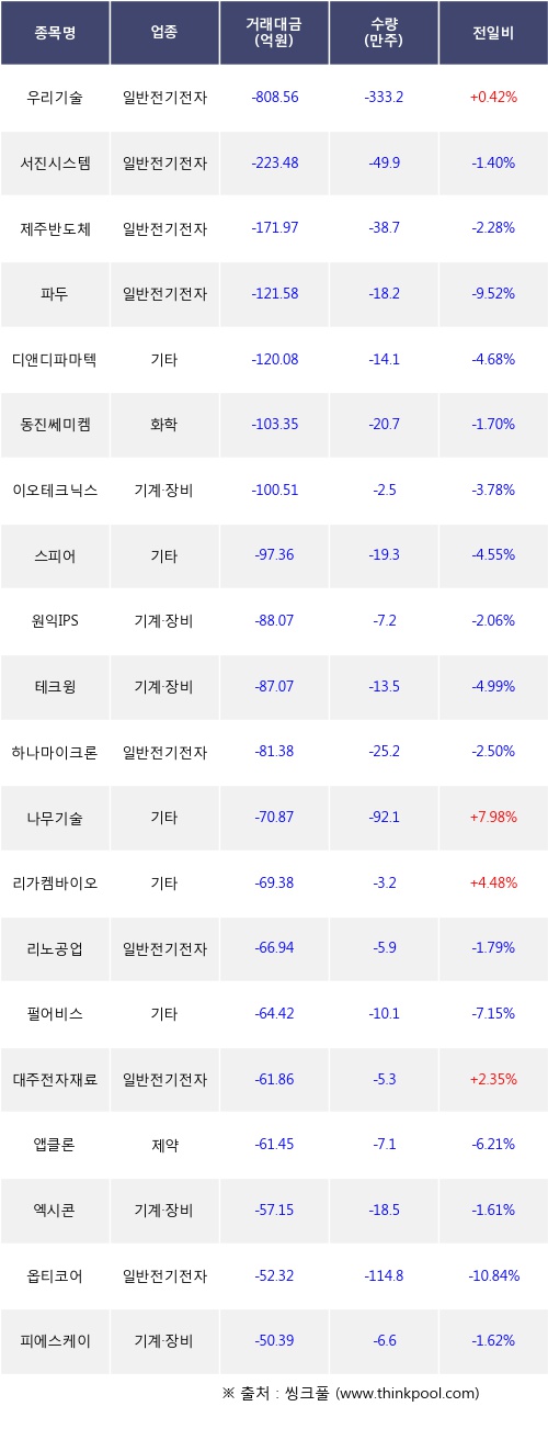 외국인 투자자의 순매도 상위 20개 종목은 우리기술, 서진시스템, 제주반도체, 파두, 디앤디파마텍, 동진쎄미켐, 이오테크닉스, 스피어, 원익IPS, 테크윙등이다.