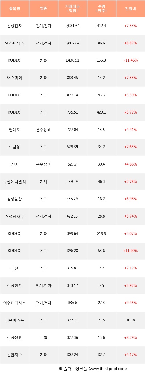 기관 투자자의 순매수 상위 20개 종목은 삼성전자, SK하이닉스, KODEX 레버리지, SK스퀘어, KODEX 200, KODEX 코스닥150레버리지, 현대차, KB금융, 기아, 두산에너빌리티등이다.