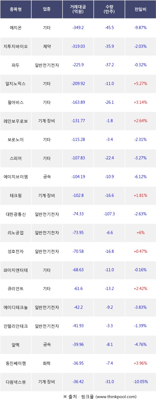 기관 투자자의 순매도 상위 20개 종목은 메지온, 지투지바이오, 파두, 알지노믹스, 펄어비스, 레인보우로보틱스, 보로노이, 스피어, 에이치브이엠, 테크윙등이다.