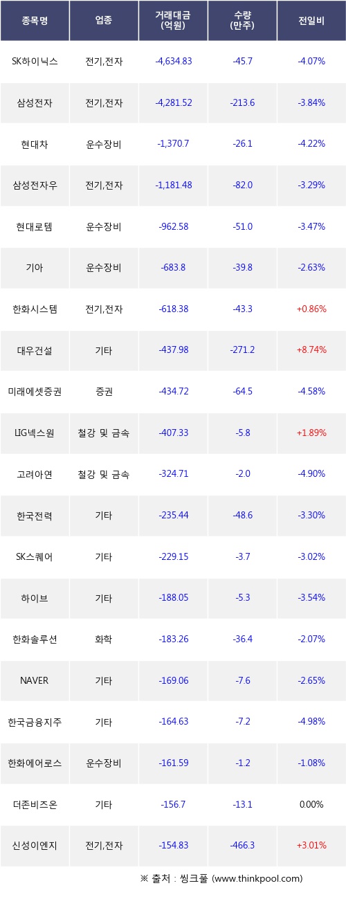 외국인 투자자의 순매도 상위 20개 종목은 SK하이닉스, 삼성전자, 현대차, 삼성전자우, 현대로템, 기아, 한화시스템, 대우건설, 미래에셋증권, LIG넥스원등이다.