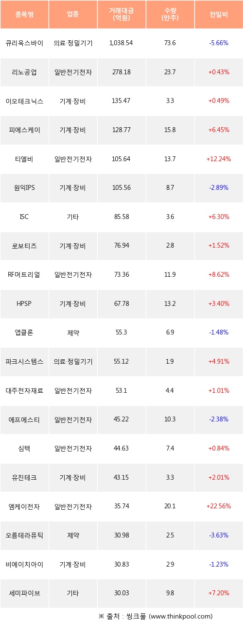 기관 투자자의 순매수 상위 20개 종목은 큐리옥스바이오시스템즈, 리노공업, 이오테크닉스, 피에스케이, 티엘비, 원익IPS, ISC, 로보티즈, RF머트리얼즈, HPSP등이다.