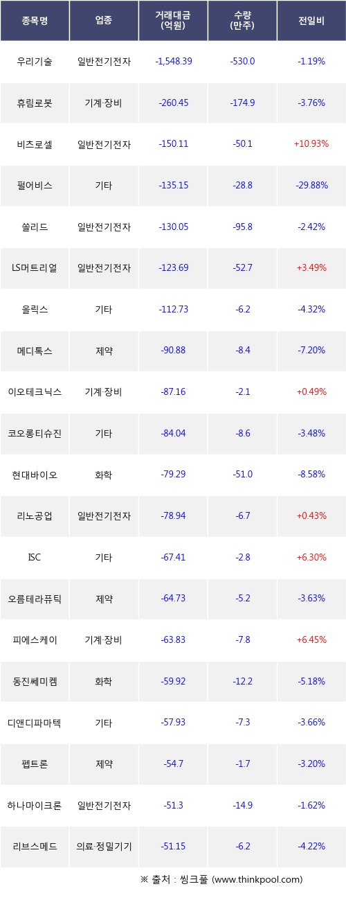 외국인 투자자의 순매도 상위 20개 종목은 우리기술, 휴림로봇, 비츠로셀, 펄어비스, 쏠리드, LS머트리얼즈, 올릭스, 메디톡스, 이오테크닉스, 코오롱티슈진등이다.