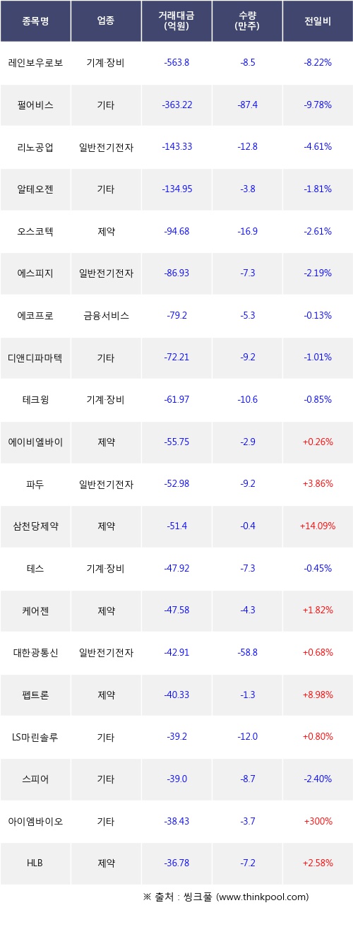 기관 투자자의 순매도 상위 20개 종목은 레인보우로보틱스, 펄어비스, 리노공업, 알테오젠, 오스코텍, 에스피지, 에코프로, 디앤디파마텍, 테크윙, 에이비엘바이오등이다.