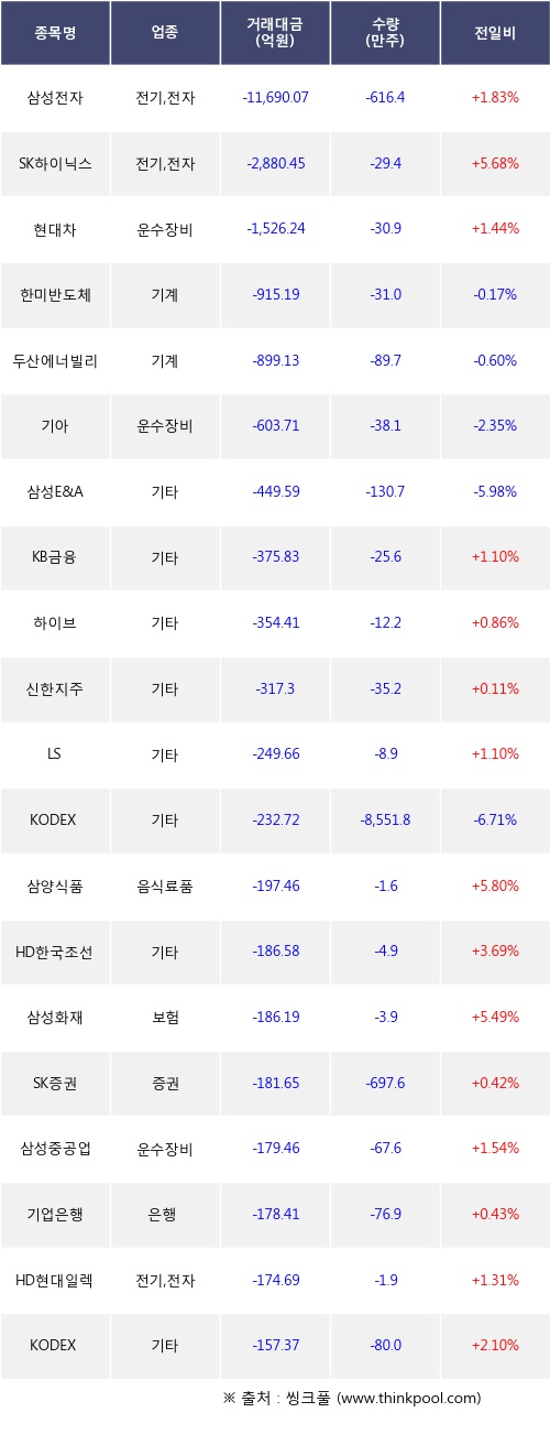 외국인 투자자의 순매도 상위 20개 종목은 삼성전자, SK하이닉스, 현대차, 한미반도체, 두산에너빌리티, 기아, 삼성E&A, KB금융, 하이브, 신한지주등이다.