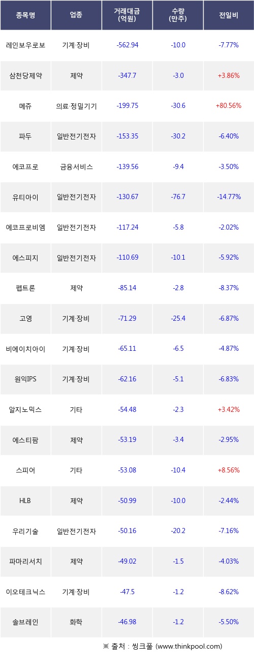 기관 투자자의 순매도 상위 20개 종목은 레인보우로보틱스, 삼천당제약, 메쥬, 파두, 에코프로, 유티아이, 에코프로비엠, 에스피지, 펩트론, 고영등이다.