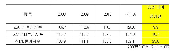 대중교통과 삼겹살, 자장면 등이 포함된 10개 품목의 물가를 나타내는 신MB물가지수는 지난 2008년 106.9에서 2011년 8월 132.1로, 52개 품목의 MB물가지수는 115.8에서 134로 상승했습니다.