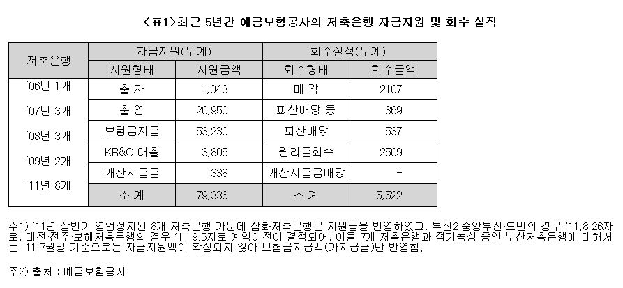 국회 정무위 소속 유원일 의원이 국정감사를 앞두고 예보로부터 받은 자료에 따르면 지난 2006년부터 2010년까지 예보는 9개 저축은행을 퇴출시키면서 3조1천여억원을 지원하고 5천여억원을 회수해 회수율이 17.8%를 나타냈습니다.