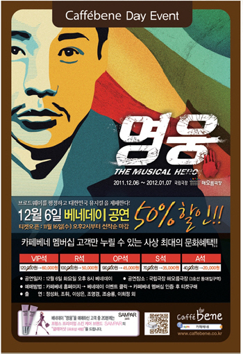 (주)카페베네(대표이사 김선권)는 뮤지컬 <영웅> 관람권을 반값에 할인 제공한다.