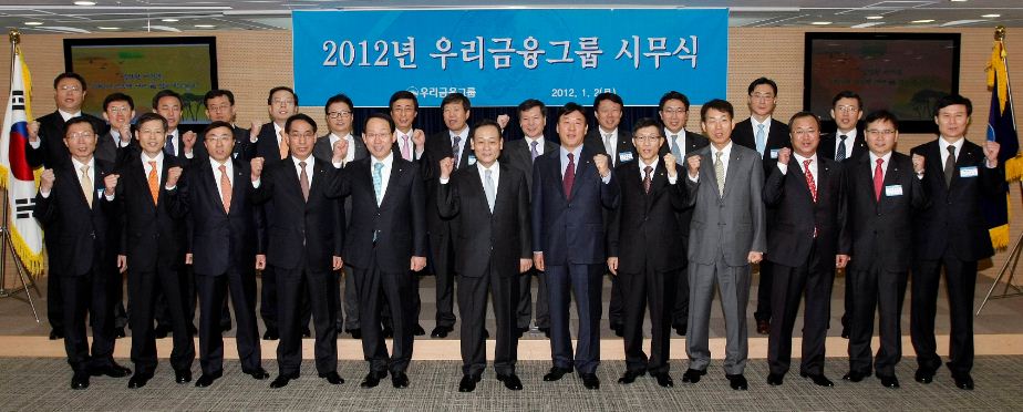 사진설명 : 우리금융그룹은 1월 2일 회현동 본점에서 신년 시무식을 갖고 이팔성회장과 임원들이 새해 힘찬 `화이팅`을 외치고 있다.