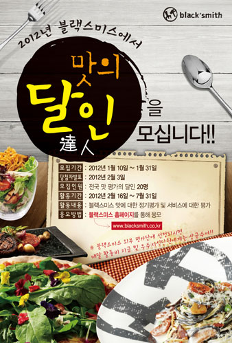 이번 ‘맛의 달인(達人)’ 이벤트에 응모를 원하는 고객들은 블랙스미스 홈페이지(www.blacksmith.co.kr)를 통해 멤버십 인증을 거친 후 응모하면 된다. 평가단에 선정되면 매달 소정의 활동비가 주어지며, 우수시식단원에게는 상금도 수여 할 예정이다.