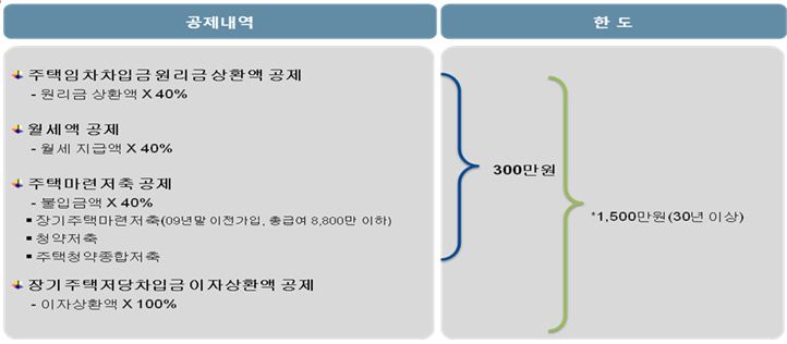 주택마련저축과 주택임차차입금원리금상환액, 월세소득공제액을 포함해 연간 300만원을 한도로 공제받을 수 있다. 장기주택저당차입금 이자상환액의 경우에는 상환기간이 15년 이상 30년 이하인 경우 모든 주택자금공제를 합해 1,000만원, 상환기간이 30년 이상인 경우에는 최대 1,500만원까지 공제가 가능하다.