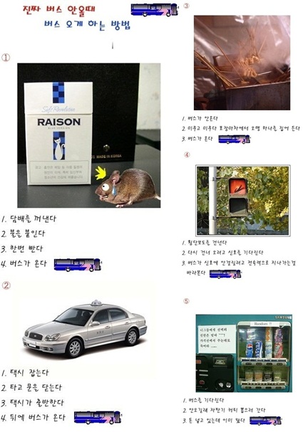 버스 오게 하는 방법이라는 이 게시물의 내용을 살펴 보면 우선 오지 않는 버스를 오게 하는 방법에는 첫 번째로 담배를 활용하는 방법이 있다. 담배 한 대를 물고 불을 켜 한 모금을 빨고 나면 버스가 온다.
