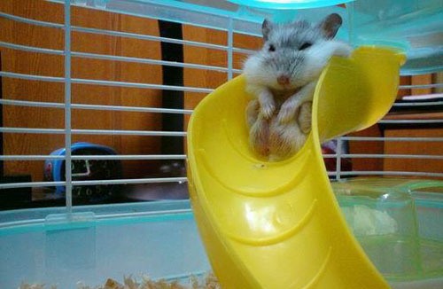 한 햄스터는 미끄럼틀이 타고 싶어 미끄럼대에 올랐다. 그러나 이 햄스터가 타기에 노란색 미끄럼대는 너무 작았다.