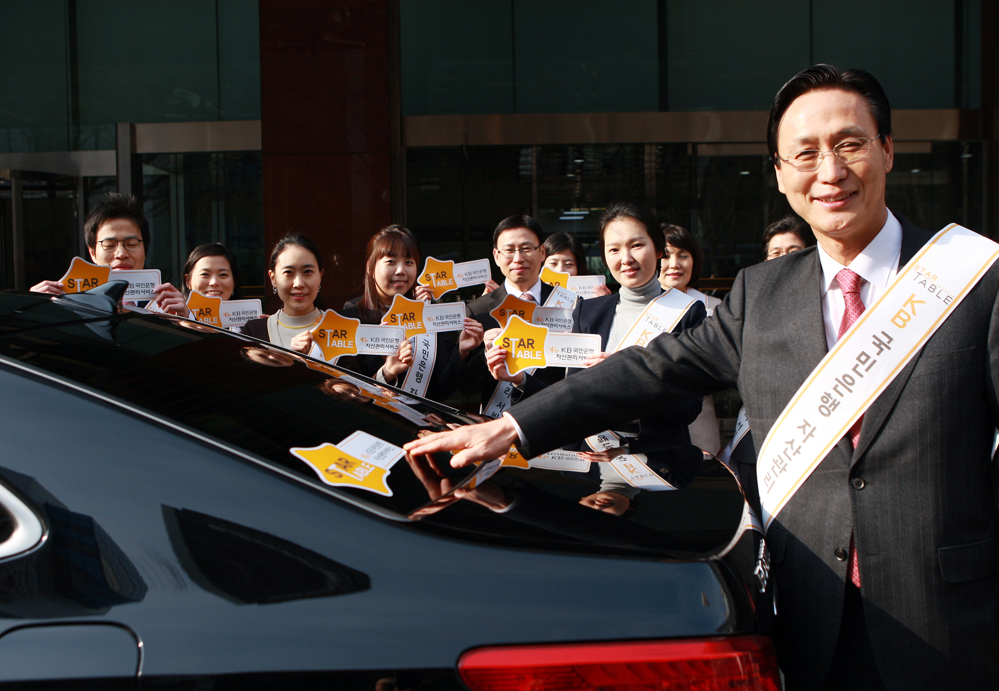 KB국민은행(은행장 민병덕)은 22일 여의도 본점에서 자산관리 서비스 브랜드 STAR TABLE 홍보와 확산을 위한 차량용 스티커 부착 행사를 가졌다고 밝혔습니다.