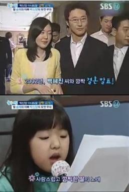 박신양과 아내는 지난 2002년 13살의 나이차를 극복하고 결혼에 골인했다. 결혼 10년 차이지만 여전히 청순하고 아름다운 외모를 자랑하는 백혜진 씨의 모습과 박승채 양의 청아한 목소리로 사랑스럽게 노래를 부르는 모습이 눈길을 끌었다.