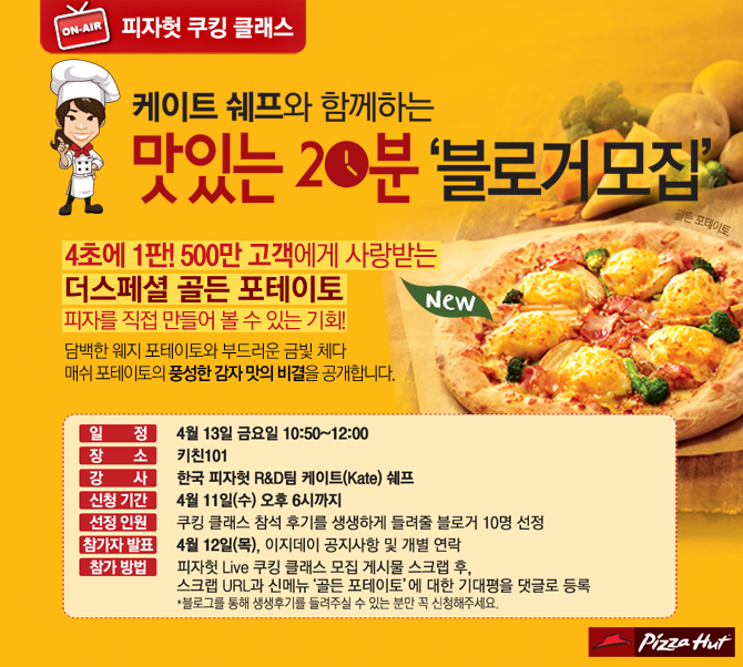 한국 피자헛(대표 이승일, www.pizzahut.co.kr)이 피자헛 쉐프와 함께 더 스페셜 피자 신메뉴인 `골든 포테이토` 쿠킹 클래스에 참가 할 블로거를 모집합니다.