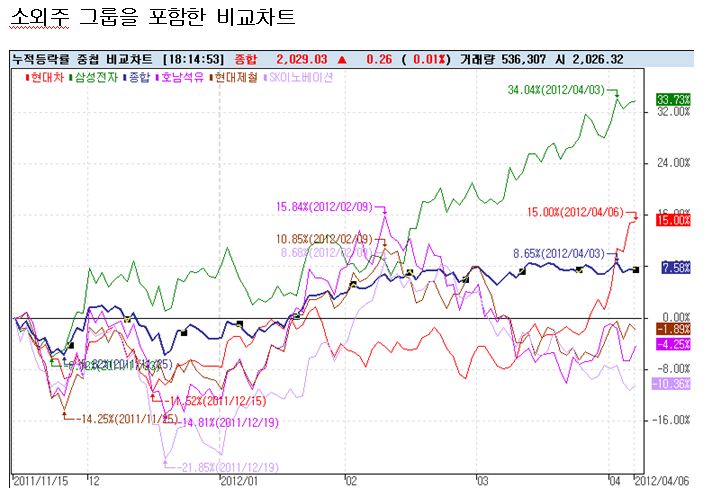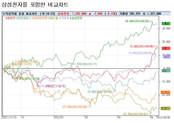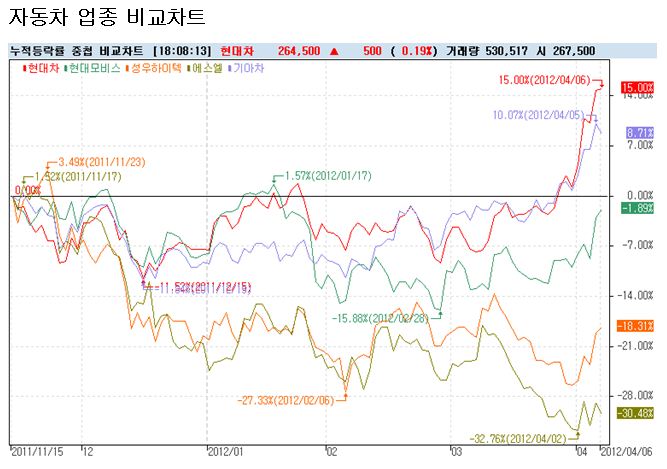 2011년 11월 15일을 기준으로 올라온 쪽은 (그것도 가장 최근에 빠르게 반응하면서) 현대차 기아차에 불과하다. 자동차가 다 좋은 것이 아니다. 자동차 업종 내에서 두 종목이 좋았을 뿐이다. 완성차가 좋은데 부품주는 안 좋다?
