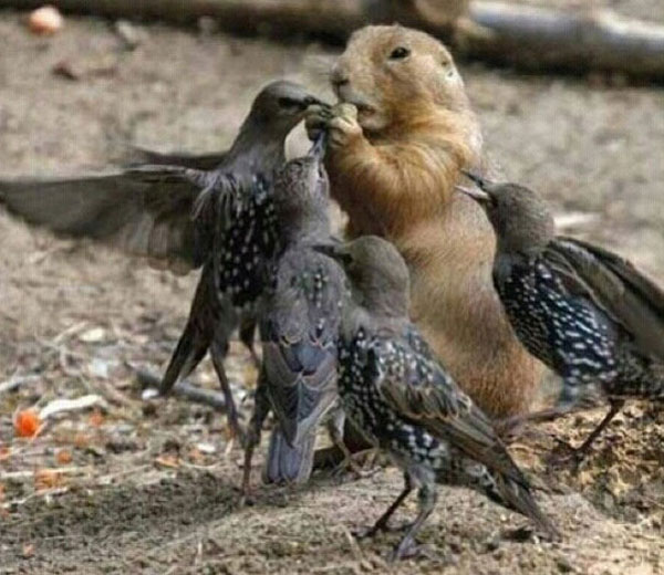 `교실에서 맛있는 거 먹을 때` 사진에는 두더지 한마리가 앞발로 먹이를 잡아 갉아먹고 있다. 주위 새들도 먹이를 빼앗으려 하는 모습이다.