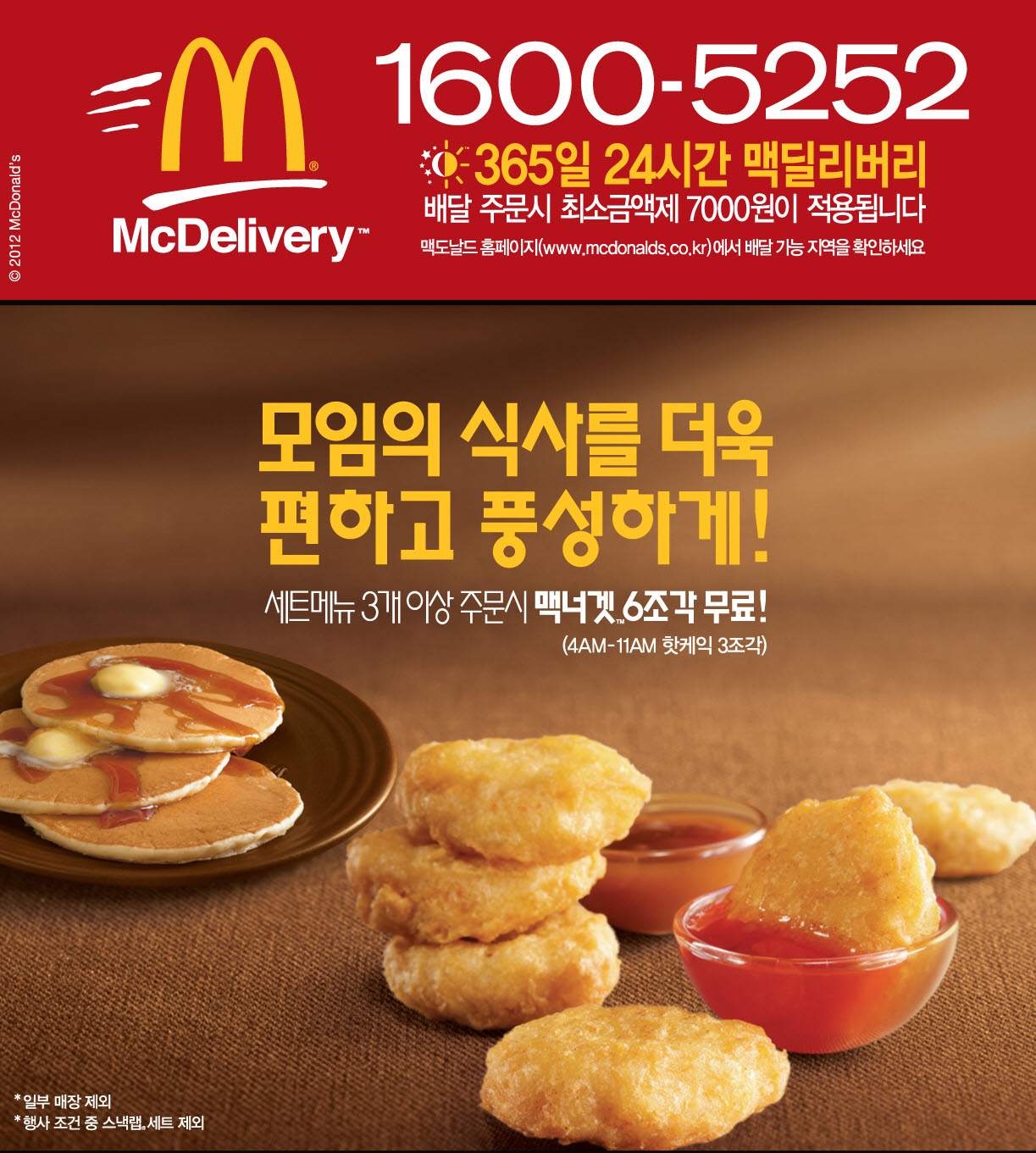 맥도날드 (대표이사 션 뉴튼, www.mcdonalds.co.kr)가 오는 5월 13일까지 배달 서비스인 맥딜리버리(McDelivery, 1600-5252)를 통해 3개 세트 메뉴를 주문하면 핫케익과 맥너겟 (McNugget) 을 무료로 배달해 줍니다.