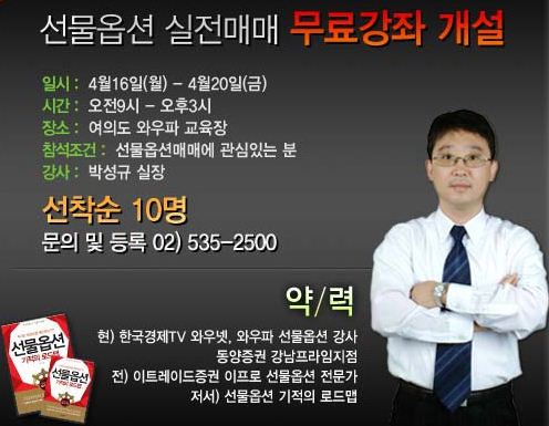 한국경제TV는 주가 하락시 수익을 낼 수 있는 파생상품에 대한 고객의 이해를 돕고 실전매매에 도움을 주기 위해 와우파 선물옵션 전임강사인 박성규 실장과 ‘선물옵션의 이해와 실전매매’라는 주제로 오는 21일(토) 오후 2시부터 5시까지 여의도 와우파 교육센터(동화빌딩6층)에서 무료강연회를 진행한다.