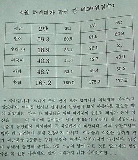 언어부터 수리 나, 외국어, 사탐까지 모든 과목 성적이 가장 낮은 반은 2반으로 멘트를 남긴 이 선생님은 2반의 담임으로 추정된다. 이 선생님은 자신이 맡은 반이 꼴찌를 하자 일명 멘붕(멘탈붕괴) 상태가 돼 성적표에 반어법 소감을 달았다.