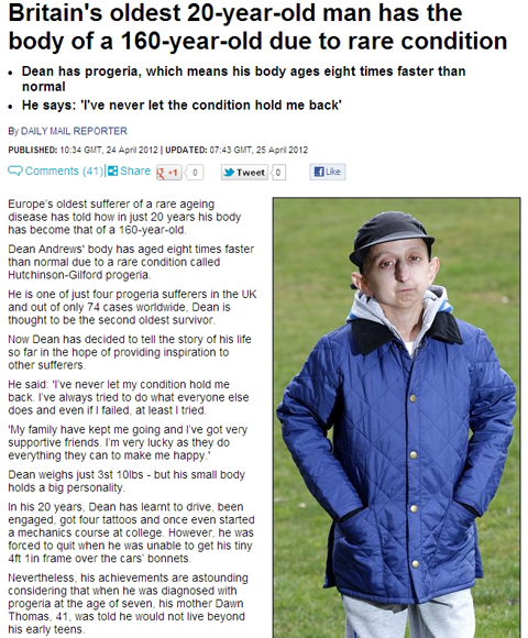 영국 일간지 데일리메일은 25일(현지시간) 선천성 조로증으로 160세 노인의 모습을 한 20살 청년 딘 앤드류를 소개했습니다.