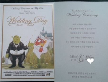 공개된 정준하의 청첩장에는 만화영화 캐릭터 슈렉과 니모의 모습이 담겨있습니다. 슈렉은 턱시도를, 니모는 웨딩드레스를 입고있습니다. 평소 부르는 애칭을 청첩장에 그대로 반영한 것입니다.