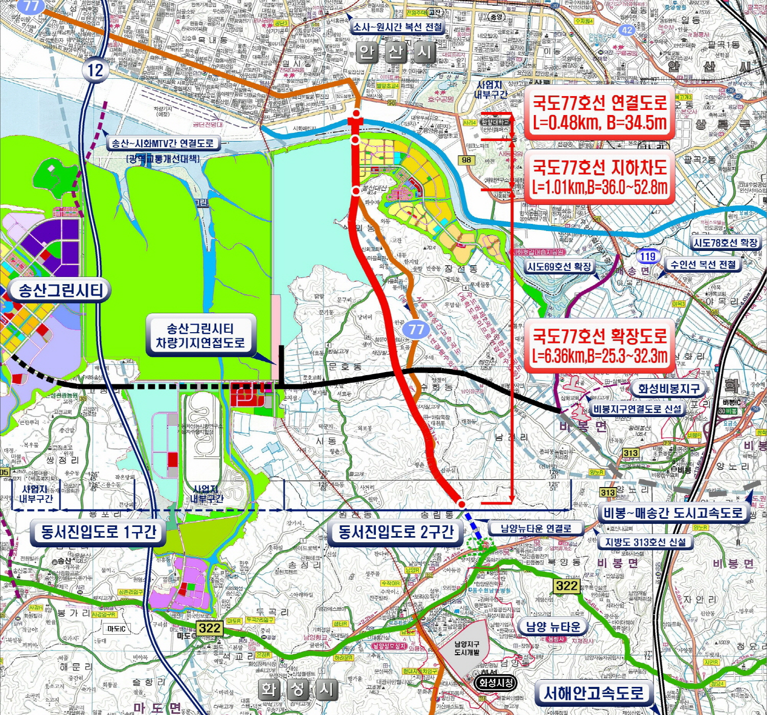 이번 공사는 경기도 화성시 송림동과 안산시 초지동 일원을 연결하는 총연장 7.85㎞의 도로와 시화교 등 교량 5곳(772.54m), 지하차도 1곳(666m), 부대시설 1식을 건설하는 겁니다.