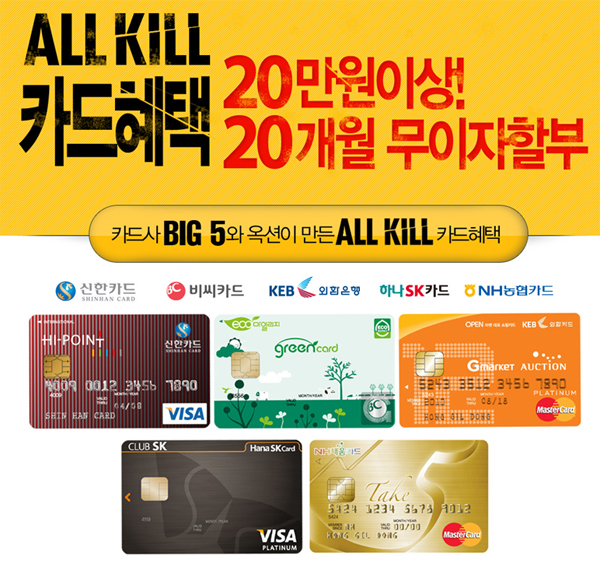 신한카드, 비씨카드, 외환카드, 하나SK카드, NH카드 등 국내 대표 카드사 5곳과 제휴, 해당 카드로 옥션 사이트에서 오는 28일까지 20만원 이상 결제 시 최장 20개월 무이자 할부를 제공하는 이벤트다.