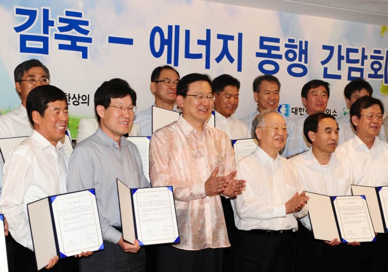 산업계는 24일 대한상의 챔버라운지에서 홍석우 지식경제부 장관 주재로 열린 `온실가스 감축 - 에너지 동행 간담회`에서 10개 대기업과 40개 협력중소기업간 ‘에너지 동행 협약’을 체결하고, 대중소기업 온실가스 동반감축 투자도 확대하기로 했습니다.