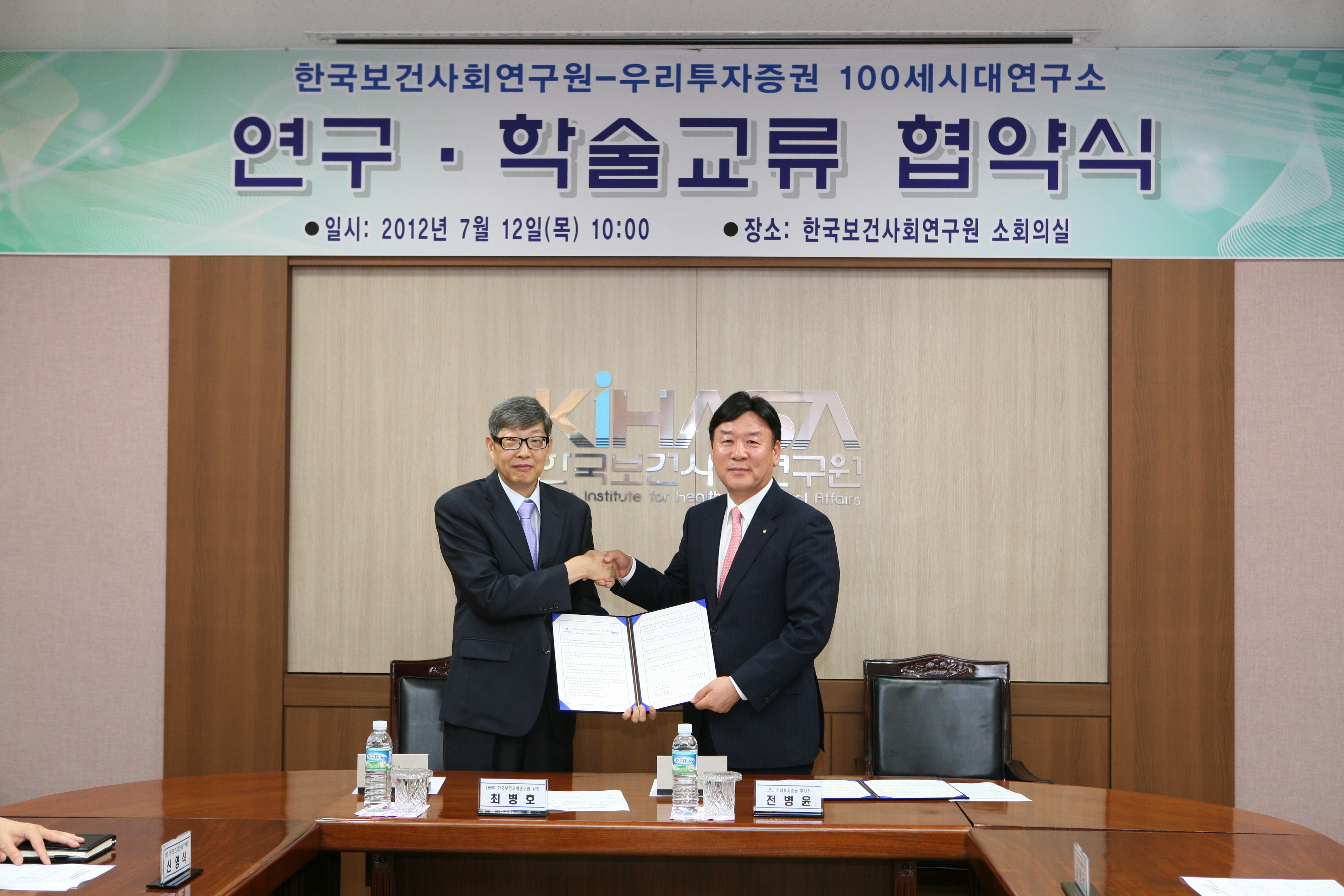 우리투자증권 100세시대연구소와 한국보건사회연구원은 앞으로 100세시대의 주요 사회적 이슈에 대한 공동연구와 관련 학술행사를 공동 개최하고 연구 인력과 자료 등을 교류할 예정입니다.