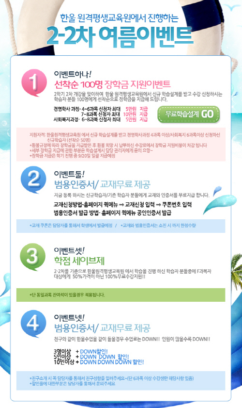 이에 한울 원격평생교육원은 사회복지사 과목을 더 확충하고, 수강생들이 더욱 즐겁게 공부할 수 있도록 정규2학기 여름맞이 이벤트를 진행 중 이며, 학습설계를 받고 최소4과목이상 등록한 수강생들 중에 우선 신청자순으로 200명을 대상으로 장학금 지급 및 30%이상의 수강료 할인혜택이 주어지며, 사회복지학과 관련 신규수강자에게는 실무연계 자격증과정을 무료로 수강할 수 있는 기회도 제공하고 있다.