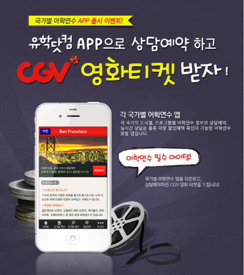 이번 이벤트는 어학연수 앱을 통해 상담 예약을 하고 문자메세지로 CGV 영화티켓 교환 쿠폰을 받은 후, 유학닷컴에서 방문상담하여 영화티켓으로 교환 받는 방법으로 참여할 수 있다. 현재까지 미국어학연수, 캐나다어학연수 앱이 출시되었고, 곧 영국어학연수 앱 출시 예정이며 계속적으로 여러 국가들로 확대할 계획이라고 관계자는 전했다.